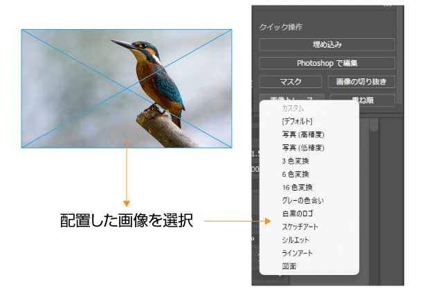 画像を配置したら、写真を選択して早速画像トレース機能を使ってみましょう。