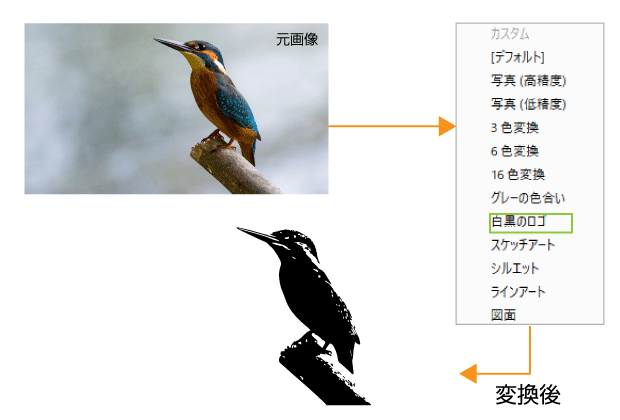 白と黒のみで抽出されます。ロゴなどの抽出に向いているモードです。